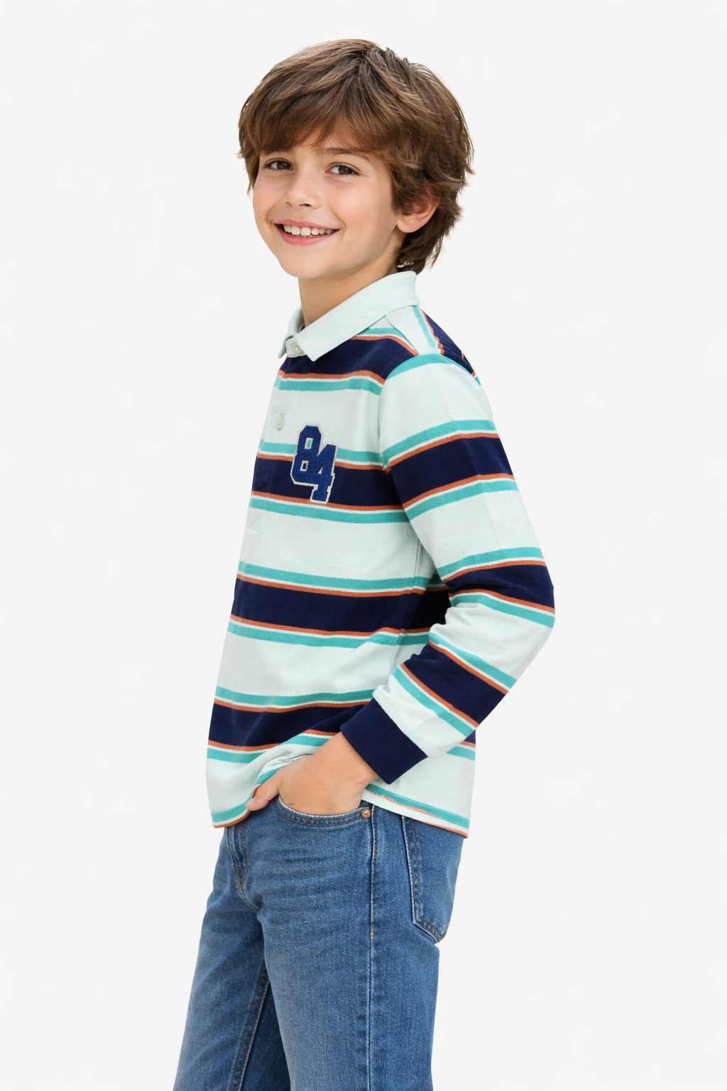This Striped Varsity Polo Tee with '84' Patch combines classic collegiate style with contemporary detail. Crafted from breathable fabric, it ensures all-day comfort and durability. The bold stripes complement the distinctive '84' patch, offering a sporty yet refined look perfect for casual and semi-formal occasions. Its tailored fit enhances silhouette definition while maintaining ease of movement, making it a versatile addition to any wardrobe.
