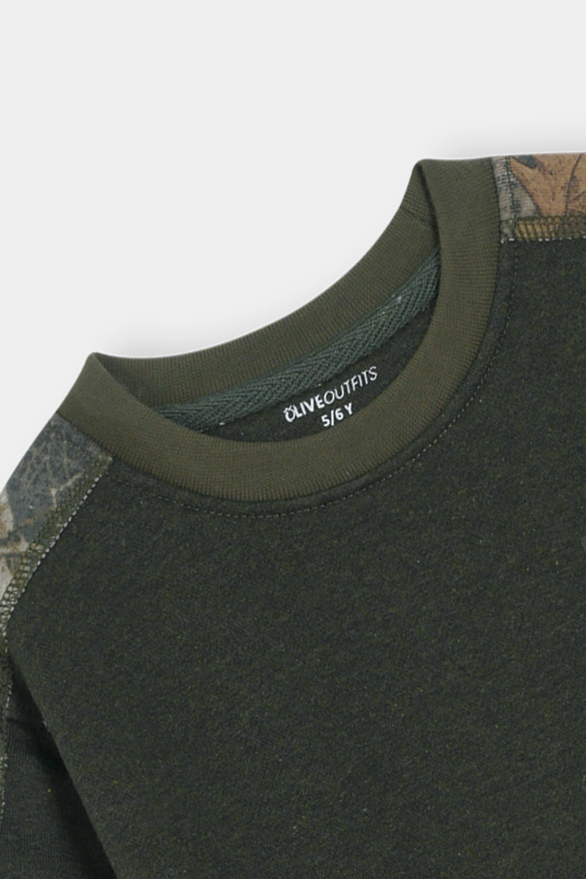 This boys' sweatshirt and jogger set features a stylish forest green camo patch design, combining durability with comfort. Crafted for active wear, the breathable fabric ensures ease of movement while maintaining warmth. The coordinated set provides a polished look suitable for casual outings or playtime, making it a practical and fashionable choice for young boys.