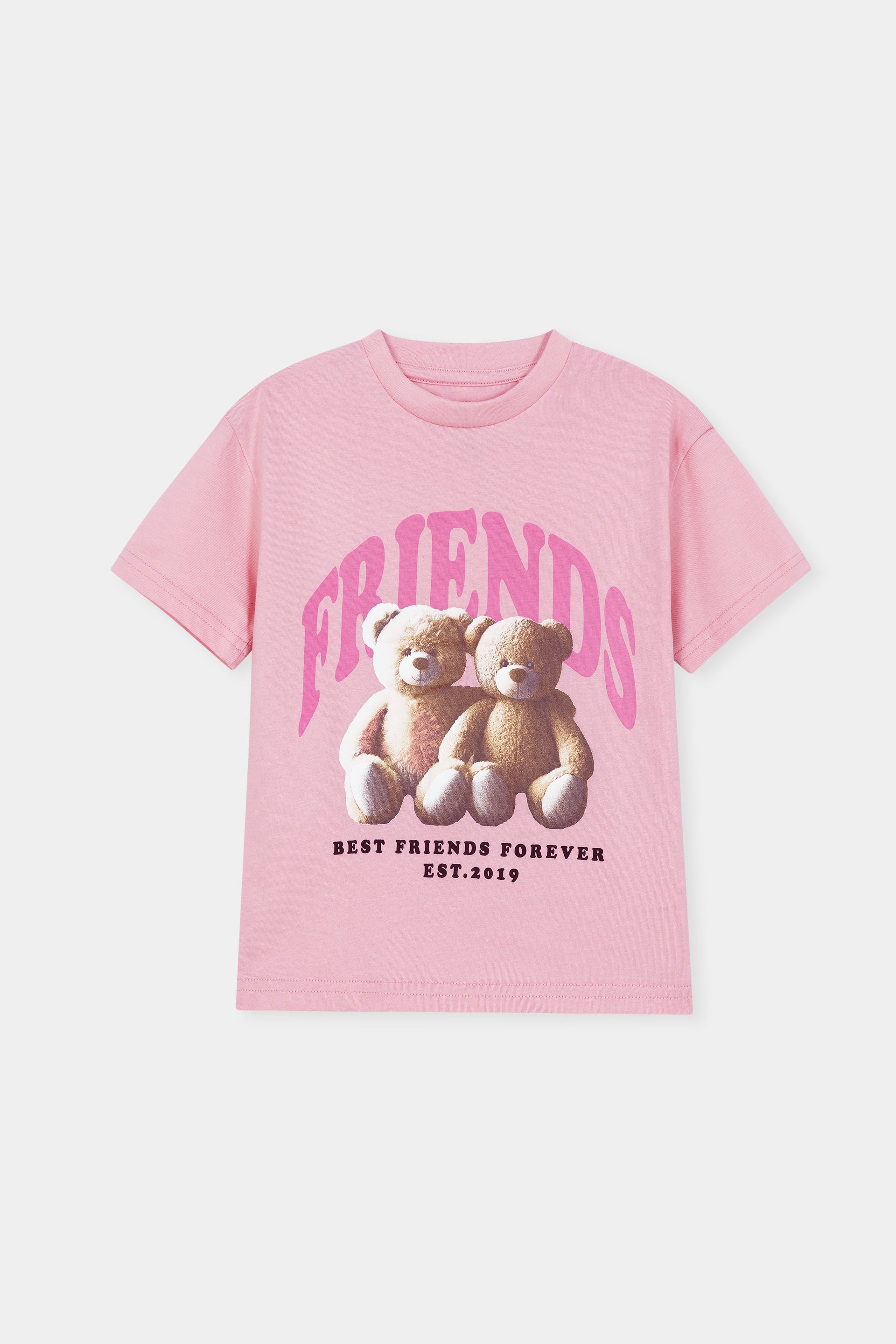 This kids pink t-shirt is made from soft and breathable cotton fabric, ensuring comfort all day long. Featuring an adorable teddy bear friends graphic with the word “Friends” printed in a stylish design, it creates a sweet and playful look that kids will love. The soft pink color adds a cheerful and trendy touch.