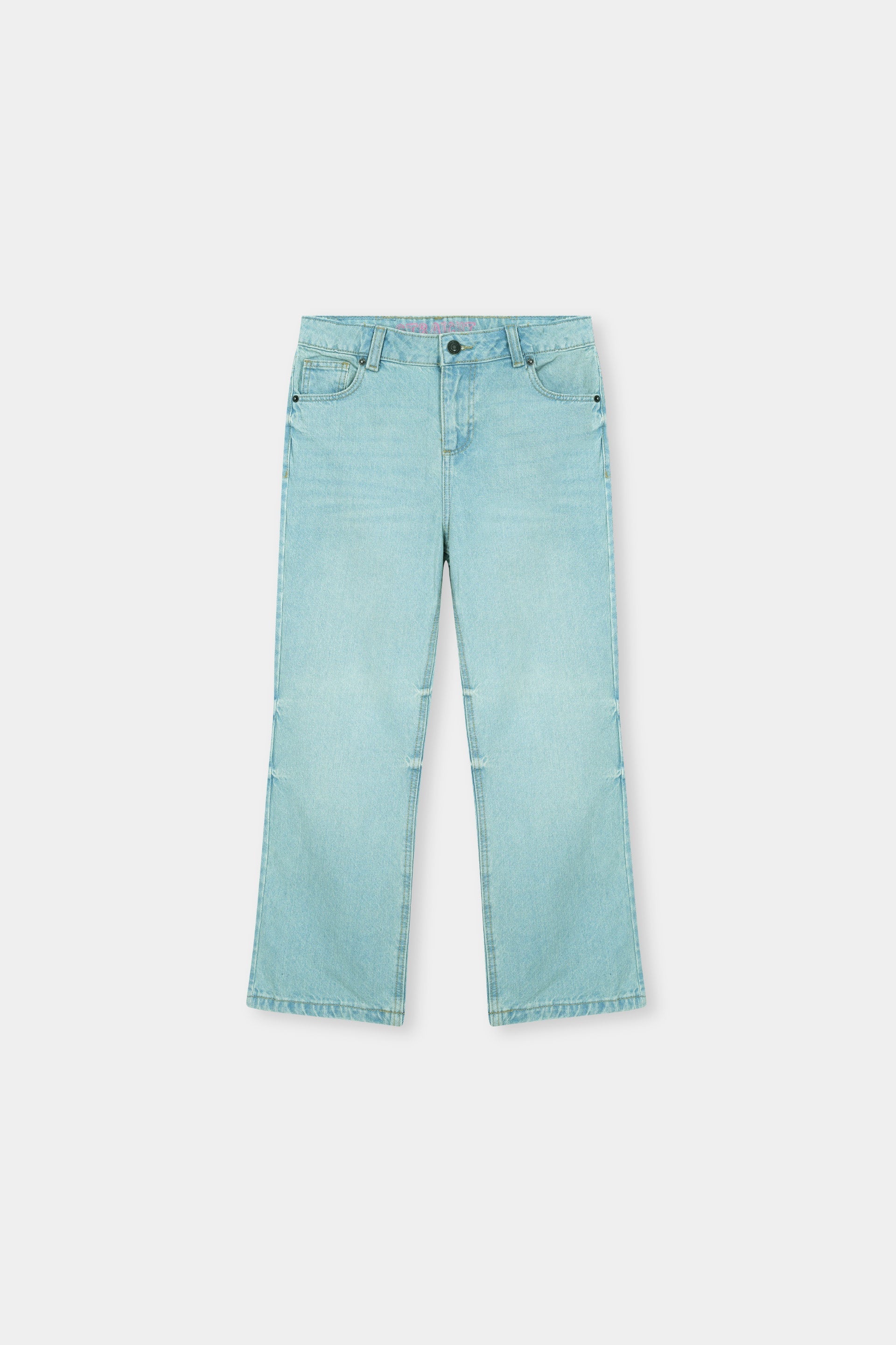 These kids' light blue denim jeans feature a trendy flared silhouette that adds a fun retro touch to any outfit. Designed with classic styling, a zip fly with button closure, and soft, durable fabric for all-day comfort. The slightly faded wash gives a laid-back, stylish vibe—perfect for pairing with t-shirts, blouses, or sweaters for a cool and casual look. Ideal for school days or weekend outings.
