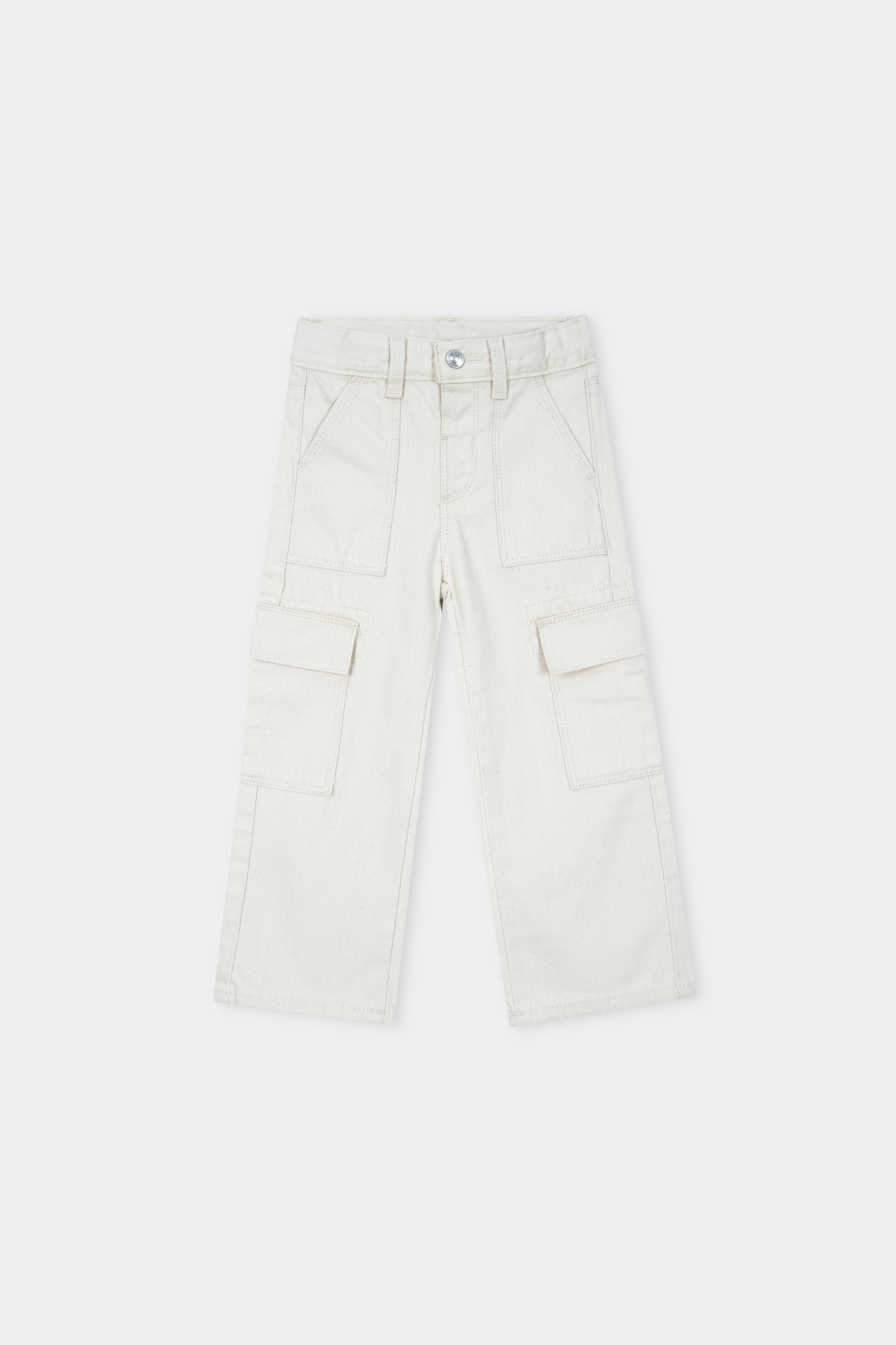These stylish off-white cargo pants for kids combine practicality with fashion. Made from durable, breathable fabric, they feature classic side cargo pockets with flaps for added utility, along with front pockets and belt loops for a secure fit. The straight-leg design offers comfort and versatility, perfect for everyday wear or casual outings. A must-have staple for your child's wardrobe