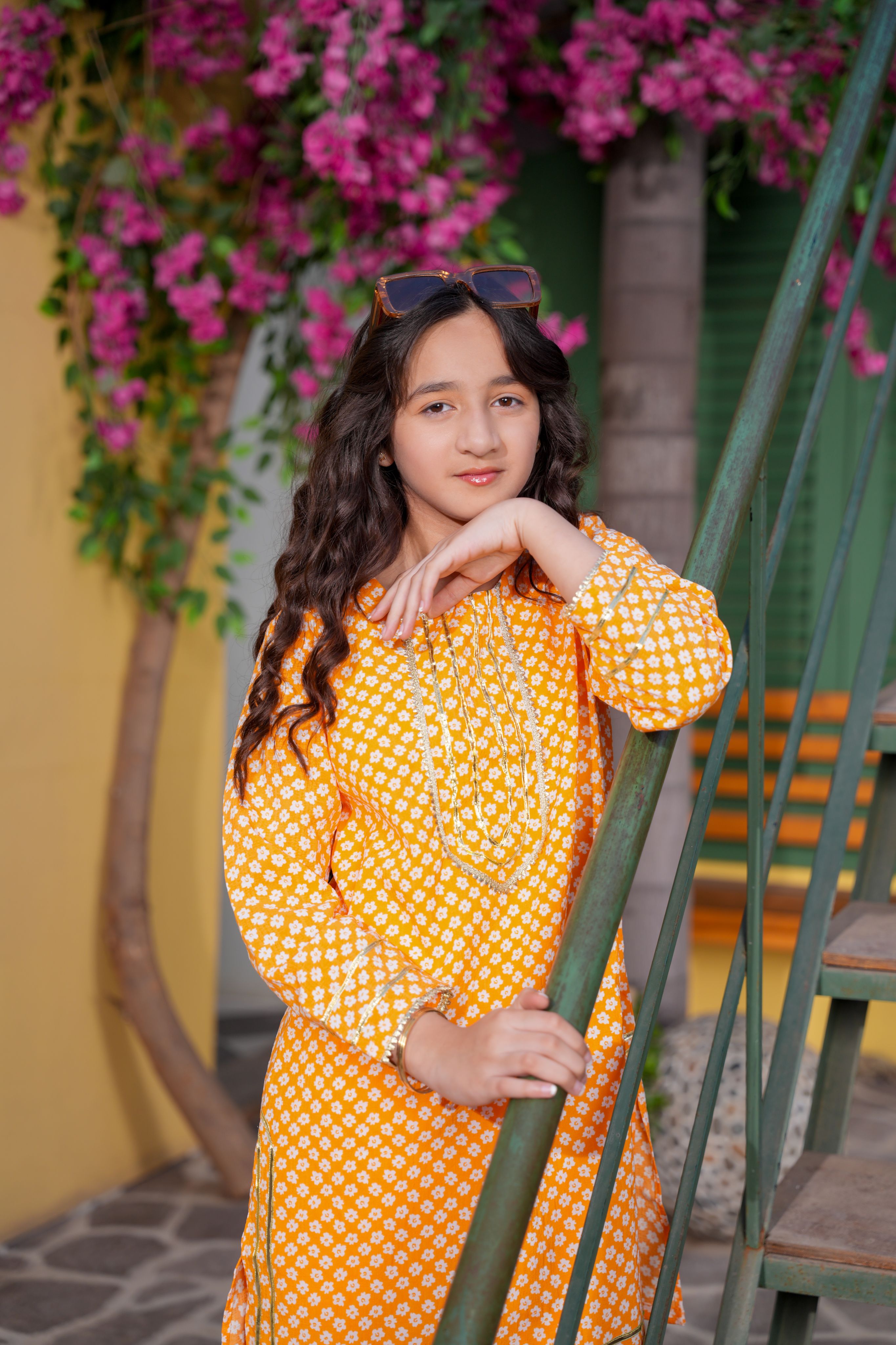 This beautiful mustard printed kurta sharara set for girls brings a perfect blend of tradition and comfort. The kurta features delicate all-over prints with elegant detailing on the neckline and sleeves, paired with a flowy sharara that adds graceful movement. Crafted from lightweight, breathable fabric, this outfit is ideal for festive occasions, family gatherings, or cultural events. Bright, stylish, and easy to wear, it’s a standout choice for special moments.