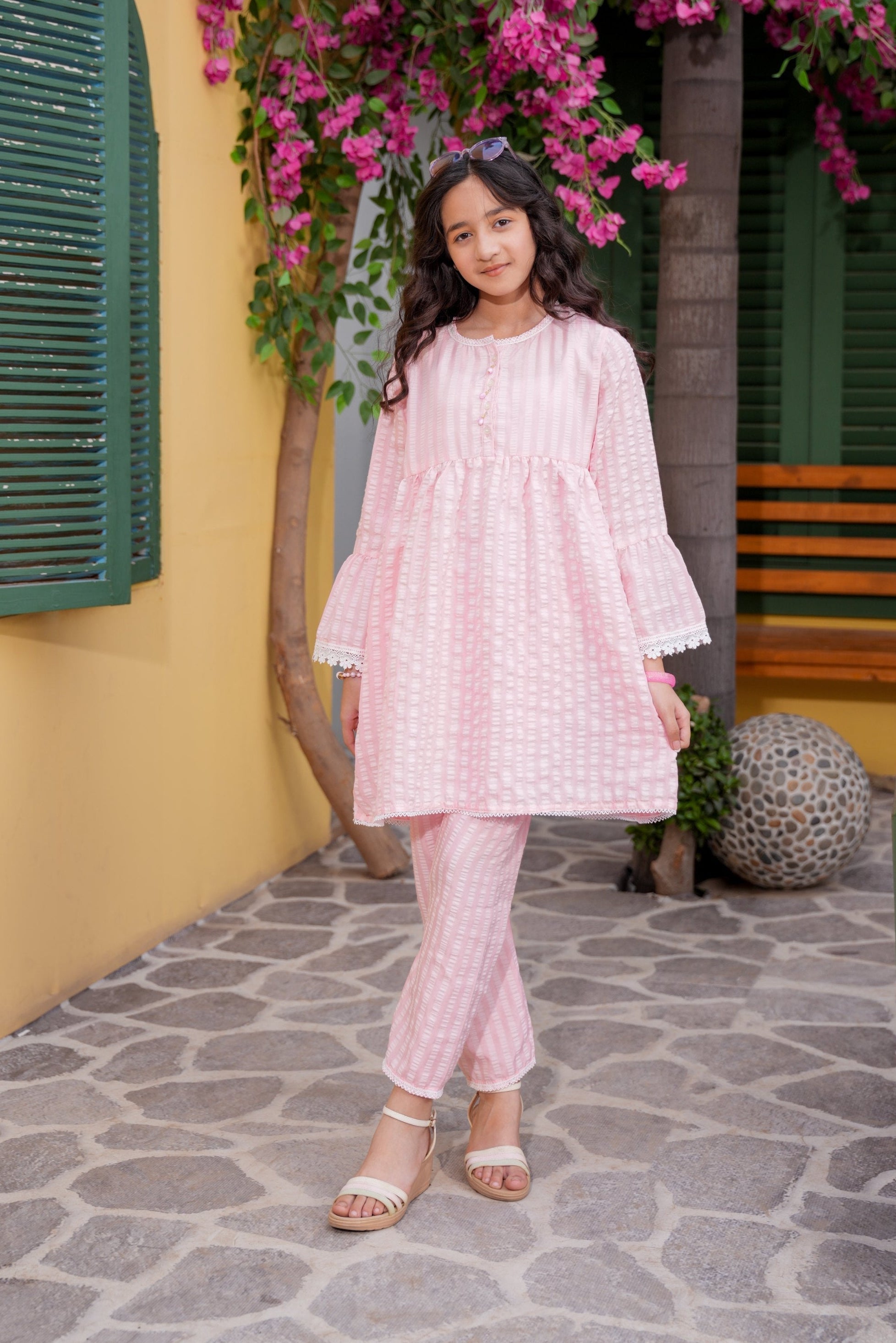 This lovely pastel pink kurta trouser set for girls is designed with a subtle textured pattern that gives it a delicate and graceful look. The kurta features a relaxed silhouette with gentle detailing on the neckline and sleeves, paired with matching straight trousers for all-day comfort. Crafted from lightweight, breathable fabric, this outfit is perfect for casual gatherings, daytime events, or festive wear. Simple, elegant, and comfortable, it’s an ideal choice for a refined everyday look.