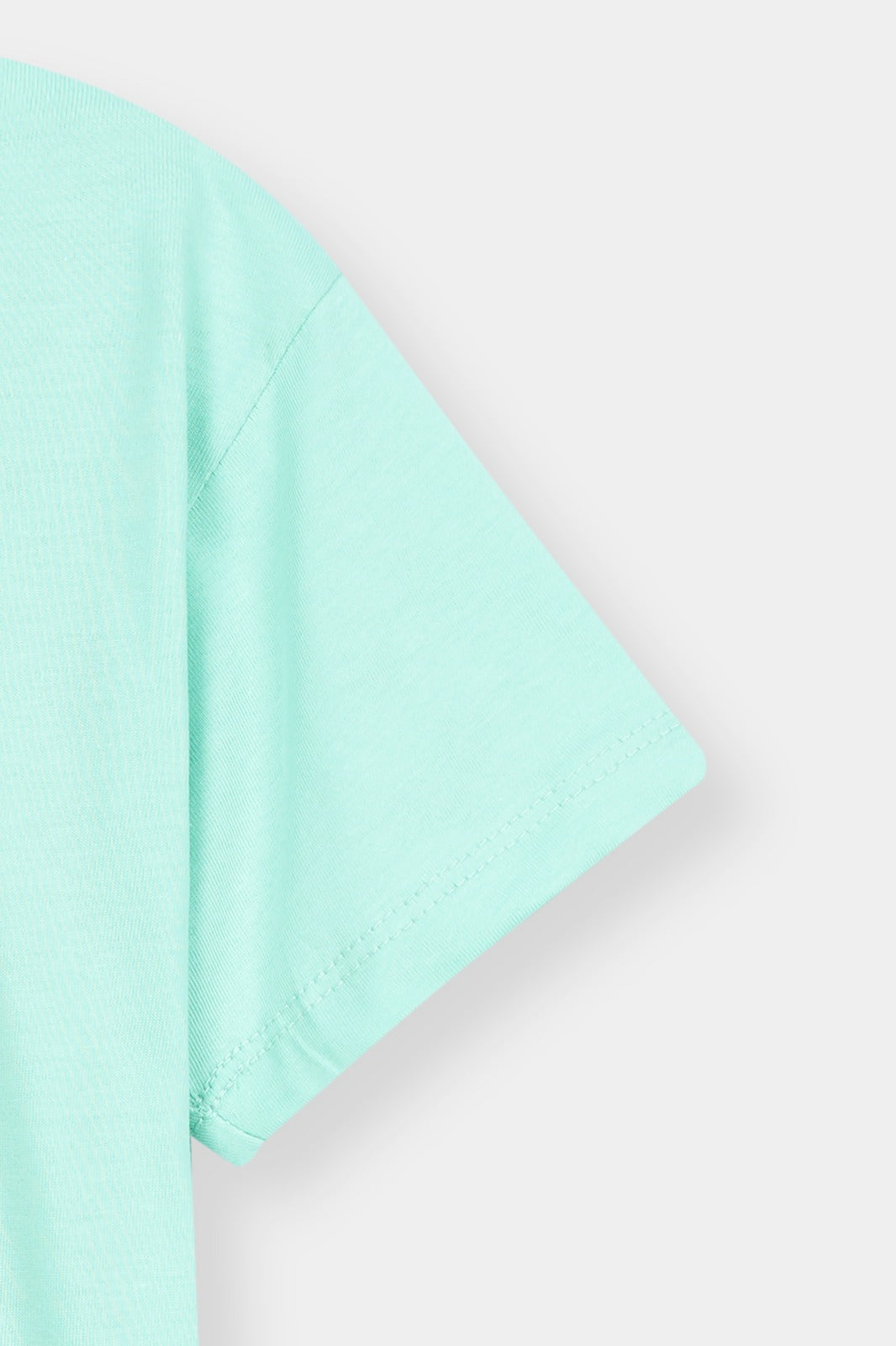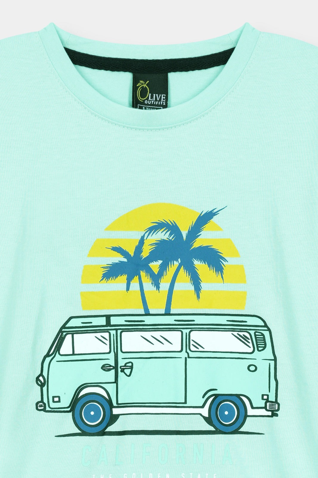 A cool and playful mint green kids t-shirt featuring a tropical sunset van graphic, perfect for casual everyday style.